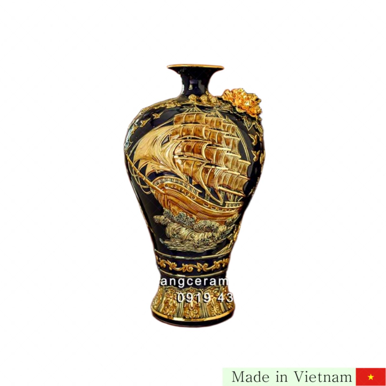 마이 빈 순풍 흑색 프리미엄 55cm는 바트짱(Bát Tràng)에서 제작한 최고급 도자기로, 24k 금박으로 정교하게 수작업 된 멋진 디자인이 돋보입니다. 부드러운 검정색 바탕 위에 빛나는 금빛 문양이 조화를 이루어, 공간의 품격을 한 단계 높여줍니다. 견고하고 세련된 이 제품은 인테리어 소품으로도, 귀한 선물로도 완벽한 선택입니다.