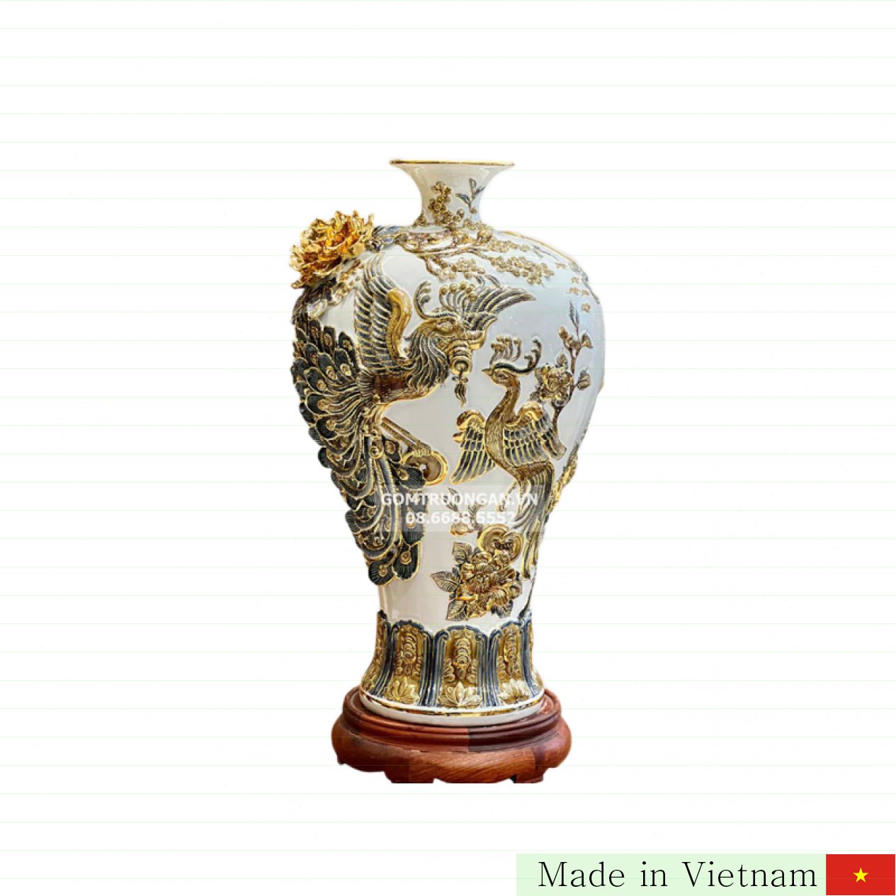 정교한 백색 자기로 완성된 ‘공단복귀(공명과 부귀)’ 문양의 55cm 고급 매병을 소개합니다. 화려한 금색 장식과 섬세한 입체 무늬가 돋보이는 이 매병은 전통 바트짱(Bát Tràng) 명품으로, 인테리어와 풍수 모두에 완벽한 아이템입니다.