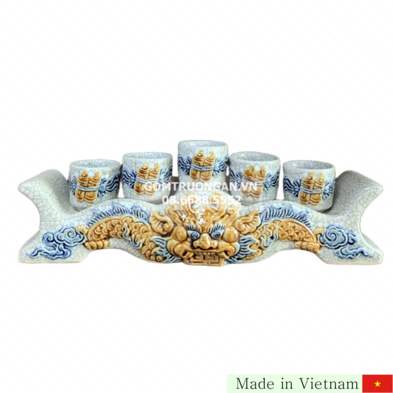 저희의 5잔 세트는 고급스러운 금빛의 균열 자기에 독특한 용 모양의 입체적인 장식으로 세련됨과 전통미를 동시에 담았습니다. 견고하면서도 정교한 제작기법으로 오래도록 빛나는 품질을 보장합니다. 집안 인테리어에 특별한 멋을 더해주는 데일리 아이템이자 선물용으로도 손색없습니다.
