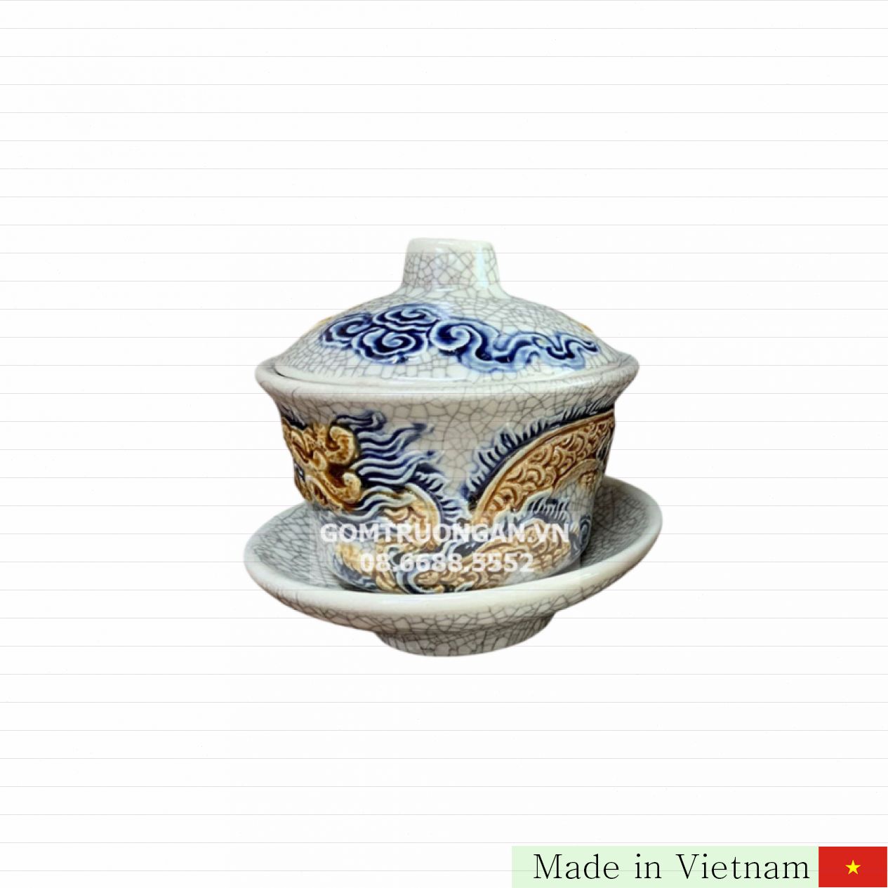 만복장춘 차그릇 세트는 한 개의 그릇, 뚜껑 1개, 그리고 받침대로 구성되어 있습니다. 유명한 바찌앙 도자기 공방(바트장)에서 제작되어 정교함과 내구성을 보장합니다. 특수한 고급 균열 장식의 유약을 사용해 세련되고 고급스러운 느낌을 주며, 오랫동안 변색이나 손상 없이 사용할 수 있습니다.
