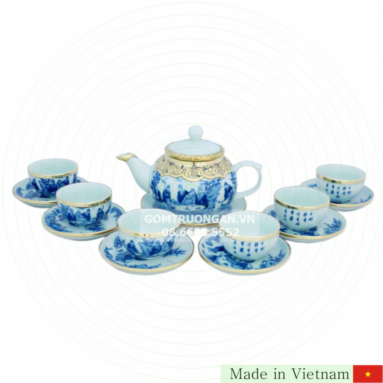 Bát Tràng의 명품, 동포장 청자 다기 세트를 소개합니다. 고급스러운 Trúc Lâm Thất Hiền 문양과 고유의 청명한 푸른빛「men lam」유약이 어우러져 한층 더 세련된 아름다움을 자랑합니다. 이 세트는 차를 즐기는 모든 순간을 특별하게 만들어줄 완벽한 선택입니다.