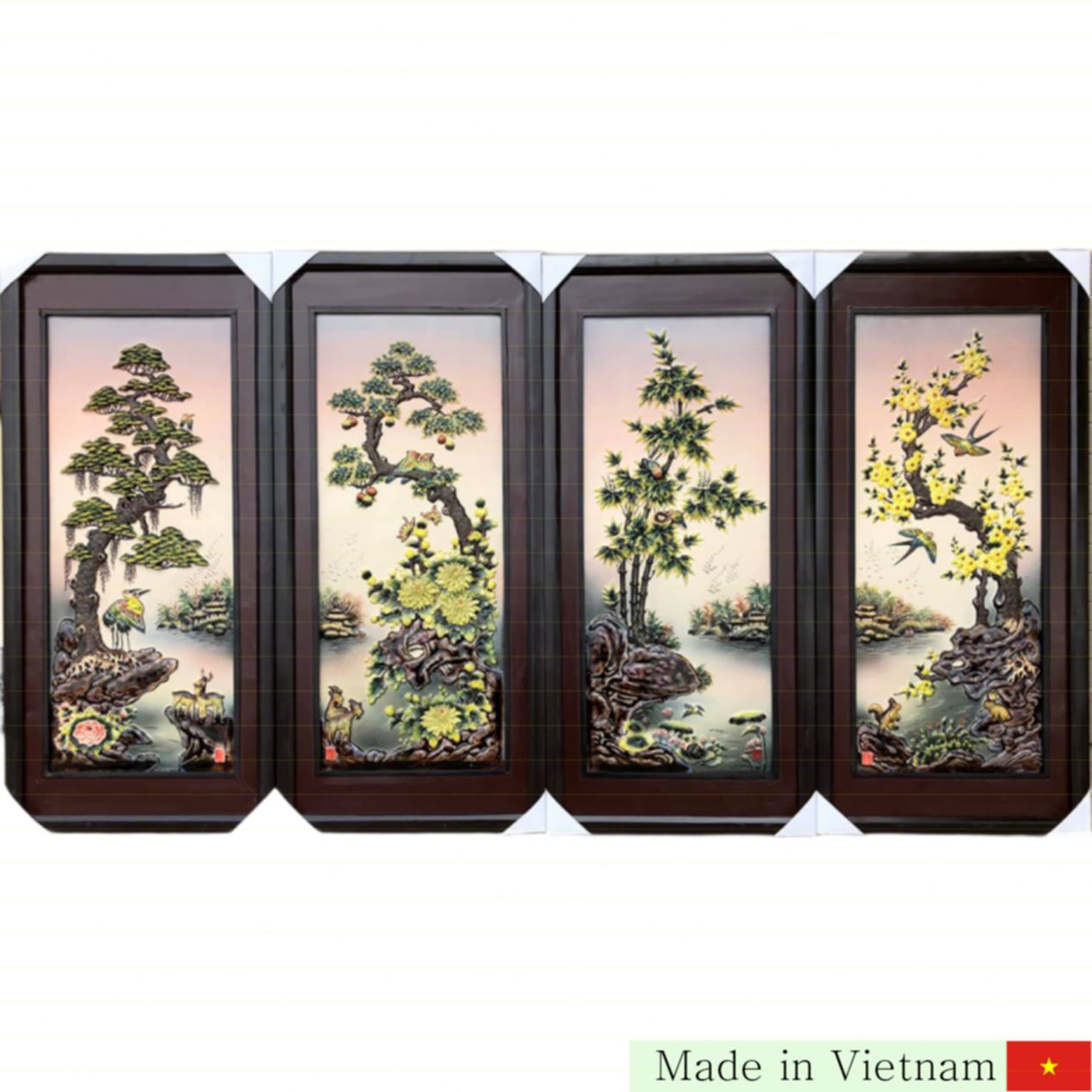 “우리”의 고급 도자기 작품, 베트남 바트짱(Bát Tràng) 전통 기술로 제작된 S2 컬러 입체 사계화 병풍형은 고품격 세라믹 아트의 정수를 보여줍니다. 각 90cm 높이, 43cm 너비의 직사각형 4폭 세트로 구성돼 있으며, 견고한 원목 액자가 고급스러운 완성도를 더했습니다. 벽걸이형으로 어느 공간에나 안심하고 걸 수 있어 거실, 사무실 인테리어에 탁월한 선택입니다.