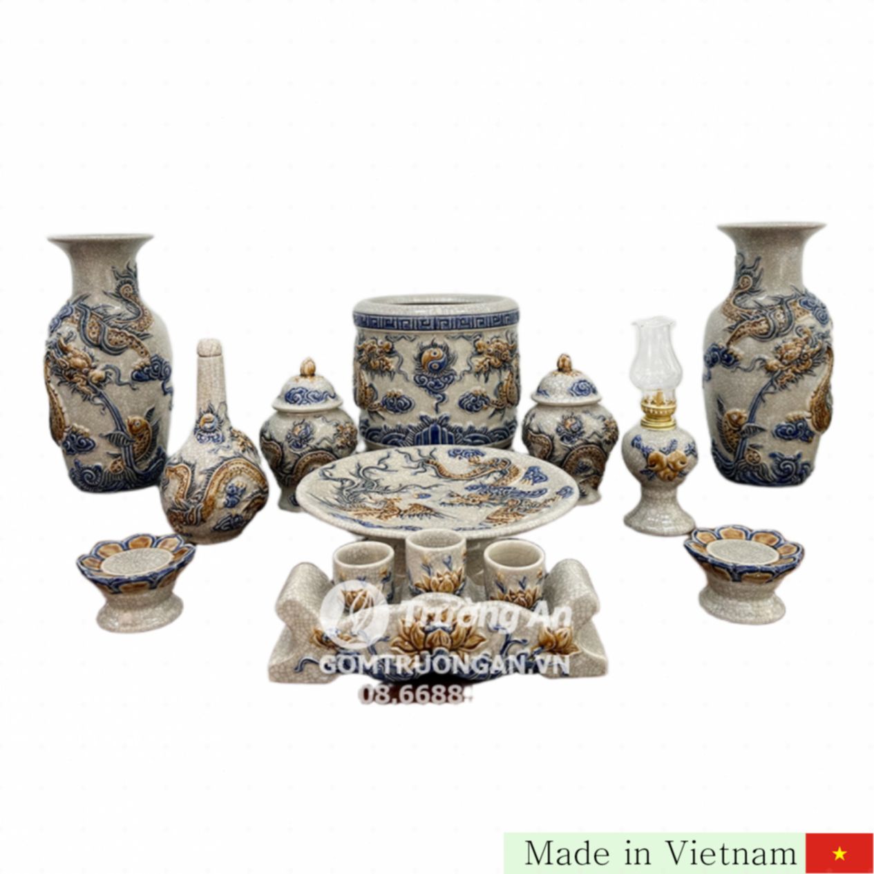 복귀용 용문이 정교하게 부조된 이 도자기 세트는 베트남 Bát Tràng 마을의 전통 수공예 기술을 그대로 담았습니다. 고급스러운 멋과 함께 고대의 멋을 재현한 균열 무늬가 특징이며, 각 아이템은 섬세하고 정밀하게 제작되어 집안의 제단 공간을 화려하게 채워줍니다.
