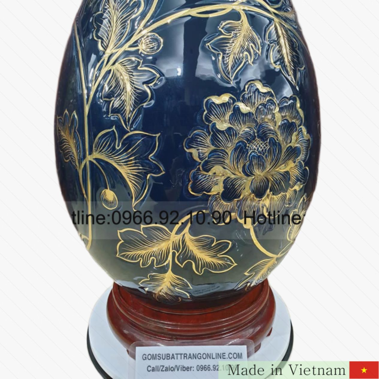Lọ tỳ bà men thiên thanh họa tiết hoa dây vẽ vàng은 전통과 현대미가 완벽하게 어우러진 최고의 도자기 작품입니다. 높이 74cm, 너비 35cm의 우아한 크기로 공간에 품격을 더해줍니다. 고전적인 tỳ bà 형태에 독특한 천청색 유약과 정교한 금박 꽃무늬가 어우러져 매우 고급스러운 분위기를 자아내죠.