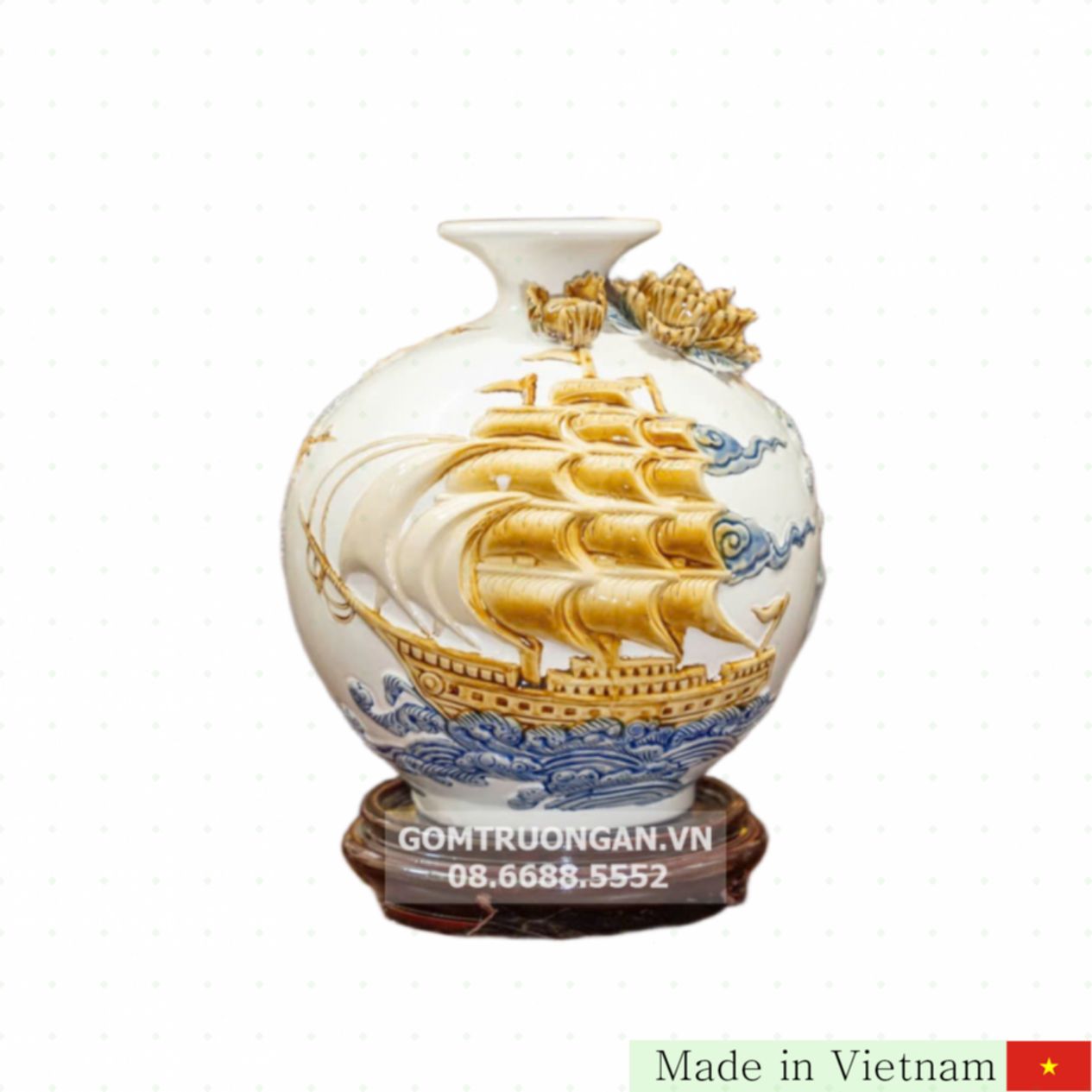 이 제품은 행운과 재물을 불러오는 전통 바트짱(Bát Tràng) 도자기, ‘순풍만리(Thuận Buồm Xuôi Gió)’ 디자인의 27cm 입체 도자기 항아리입니다. 고급스러운 입체 기법으로 제작되어, 어느 공간에 두어도 세련되면서도 풍수지리적 의미가 살아 숨 쉬는 인테리어 아이템입니다.