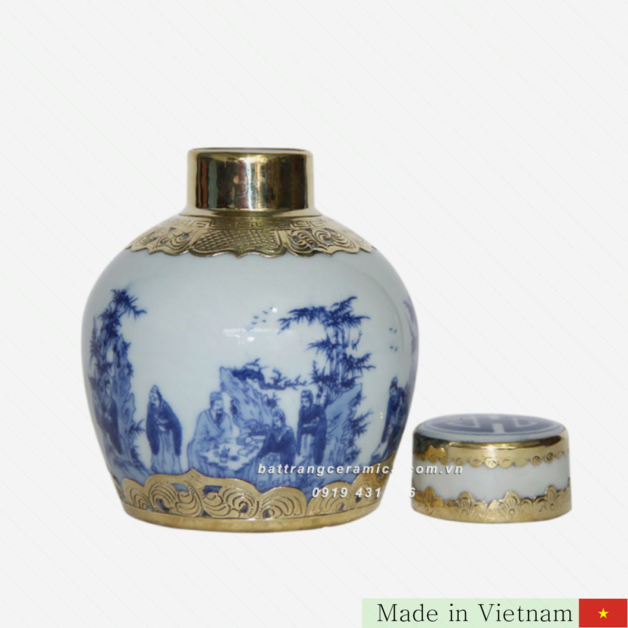 차를 사랑하는 분들을 위한 최고의 선택, 이 죽림칠현 동포장 다통은 품격과 전통을 담아 고급스럽게 제작되었습니다. 높이 14cm, 최대 직경 12cm로 실용적인 크기를 자랑하며, 뛰어난 세라믹 품질과 동으로 감싼 외관이 차 보관에 완벽함을 더합니다.