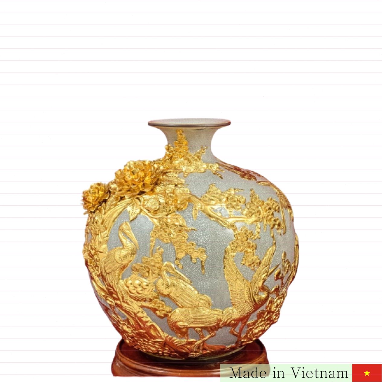 복록연명 장수 금박 균열무늬 도자기 항아리는 베트남 바트짱(Bát Tràng) 전통 도자기의 정수를 담은 최고급 장식품입니다. 숙련된 장인들이 세심하게 제작하여 오랜 시간 변치 않는 아름다움과 풍성한 행운의 상징이 되는 작품입니다.