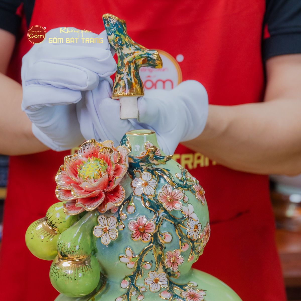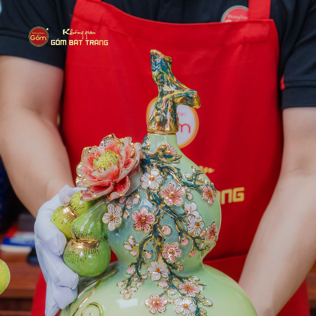 Bình Hồ Lô Xanh Cốm Tài Lộc Vẽ Vàng은 100% 전통 바트짱 수공예 방식으로 제작되어 깊이 있는 아름다움을 자랑합니다.