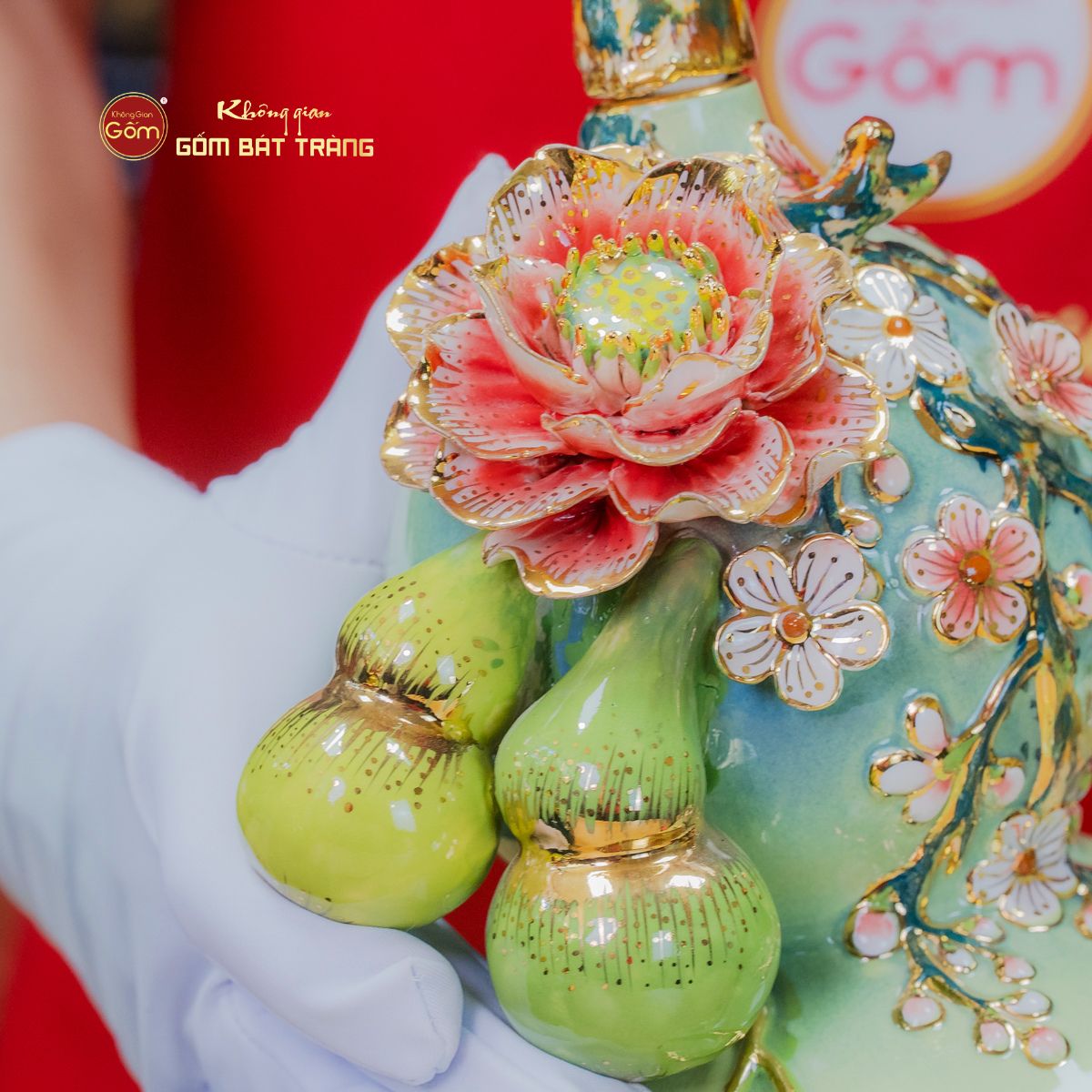 Bình Hồ Lô Xanh Cốm Tài Lộc Vẽ Vàng은 정교한 수공예 기술로 완성된 고급 도자기 제품입니다. 부드러운 청록빛 유약과 금박 장식이 조화를 이루어 집안이나 사무실 공간을 한층 고급스럽고 평화롭게 만들어줍니다. 이 제품은 행운과 번영을 상징하는 의미를 담아 인테리어와 선물용으로도 매우 사랑받고 있습니다.