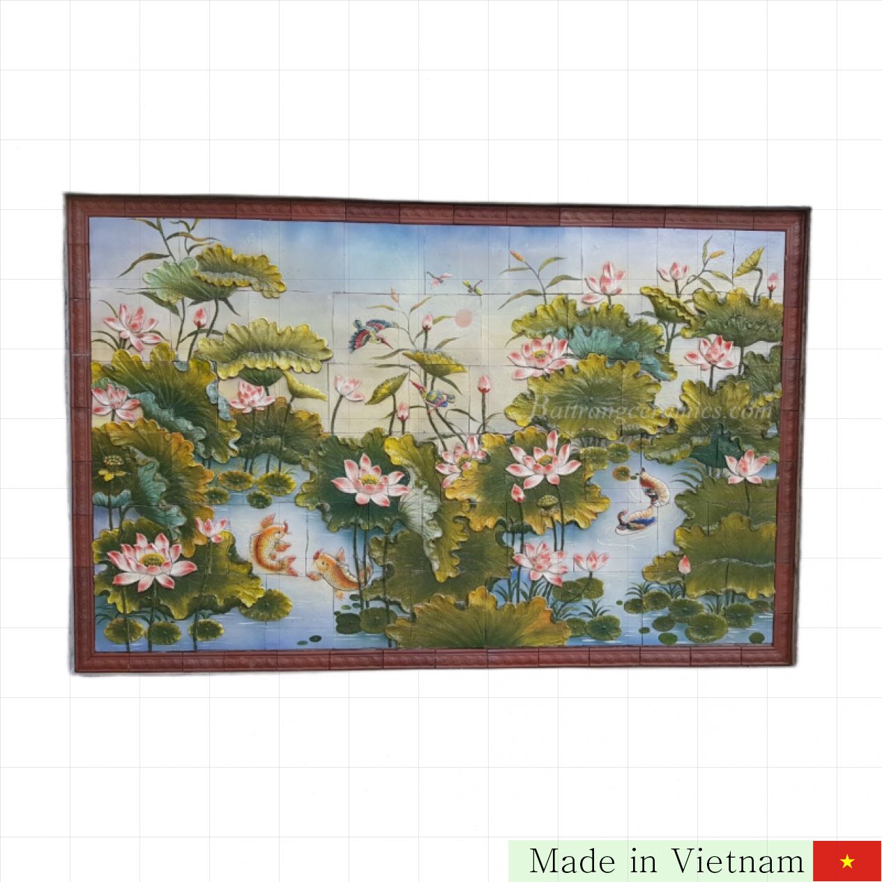 연꽃은 베트남의 국화로서 고귀함과 순수함, 그리고 굳센 의지를 상징합니다. 잉어와 연꽃 도자기 액자는 단순 장식을 넘어, 문화적 가치와 정신을 담아 특별한 공간을 연출합니다. 개인 주택, 오피스, 호텔, 카페 또는 공공 조경 등 다양한 환경에서 아름다움과 전통의 조화를 이룹니다.