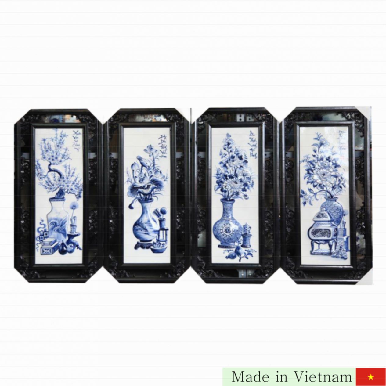 저희 제품은 전통의 숨결이 깃든 바트랑 도자기 공예의 정수를 담은 사사화(사계절 사화)를 표현한 청자 입체 그림입니다. 50cm 너비와 100cm 높이의 세로 직사각형 크기로, 견고한 소나무 원목 프레임으로 깔끔하게 마감되어 고급스러운 느낌을 제공합니다. 이 그림은 공간에 우아함과 풍성한 의미까지 선사합니다.