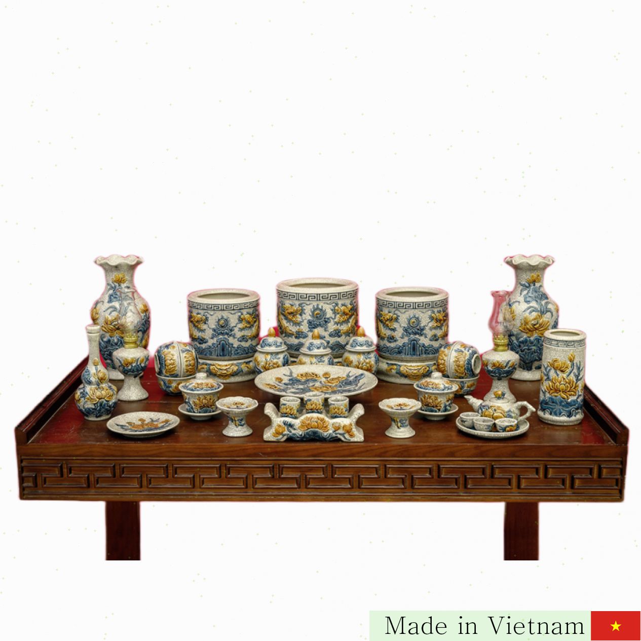 구성 품목: 2개의 연꽃 꽃병, 향로 3개, 향로 받침 3개, 19cm 높이의 촛대 3개, 쟁반 1개, 제례 기구 3종, 제례 그릇 6개, 인삼 그릇 2개, 주전자 세트 등