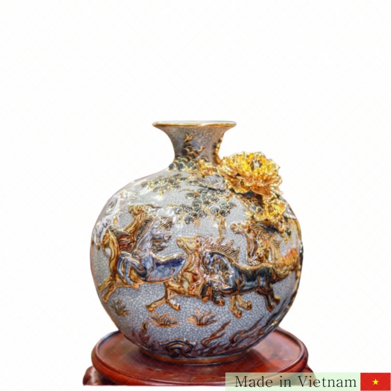 이 도자기는 바트랑 도예 장인들이 오랜 전통과 최신 기술로 빚어낸 걸작입니다. 고온에서 구워낸 견고한 소재는 특별한 균열 유약(크랙 유약)과 정교한 금분 장식으로 고급스러움을 더합니다. 각 병마다 수작업으로 황금빛 채색이 입혀져 있어 어떤 공간에 놓아도 눈길을 사로잡는 화려한 명품입니다.
