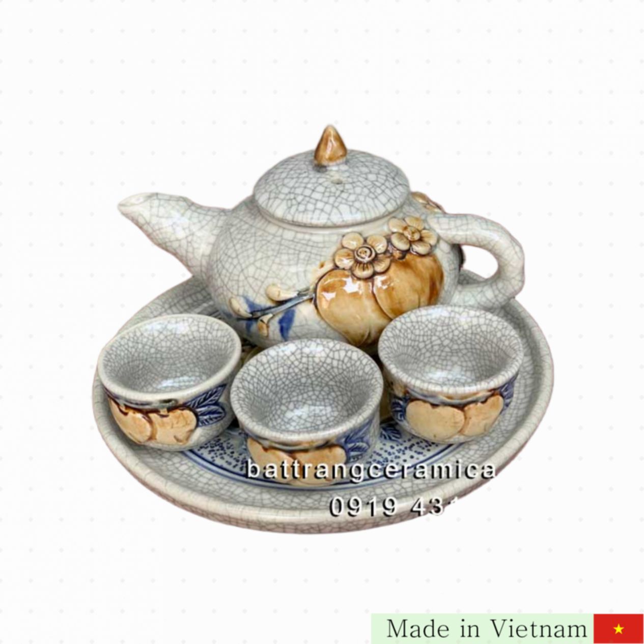 이 ấm찻잔 세트는 정교한 men rạn(금 가는 무늬) 기법과 입체적인 부조 장식으로 고급스러운 분위기를 자아냅니다. 핸드메이드 제품으로 각기 다른 아름다움을 지니며, 전통 Bát Tràng 도자기의 장인정신이 깃들어 있습니다.