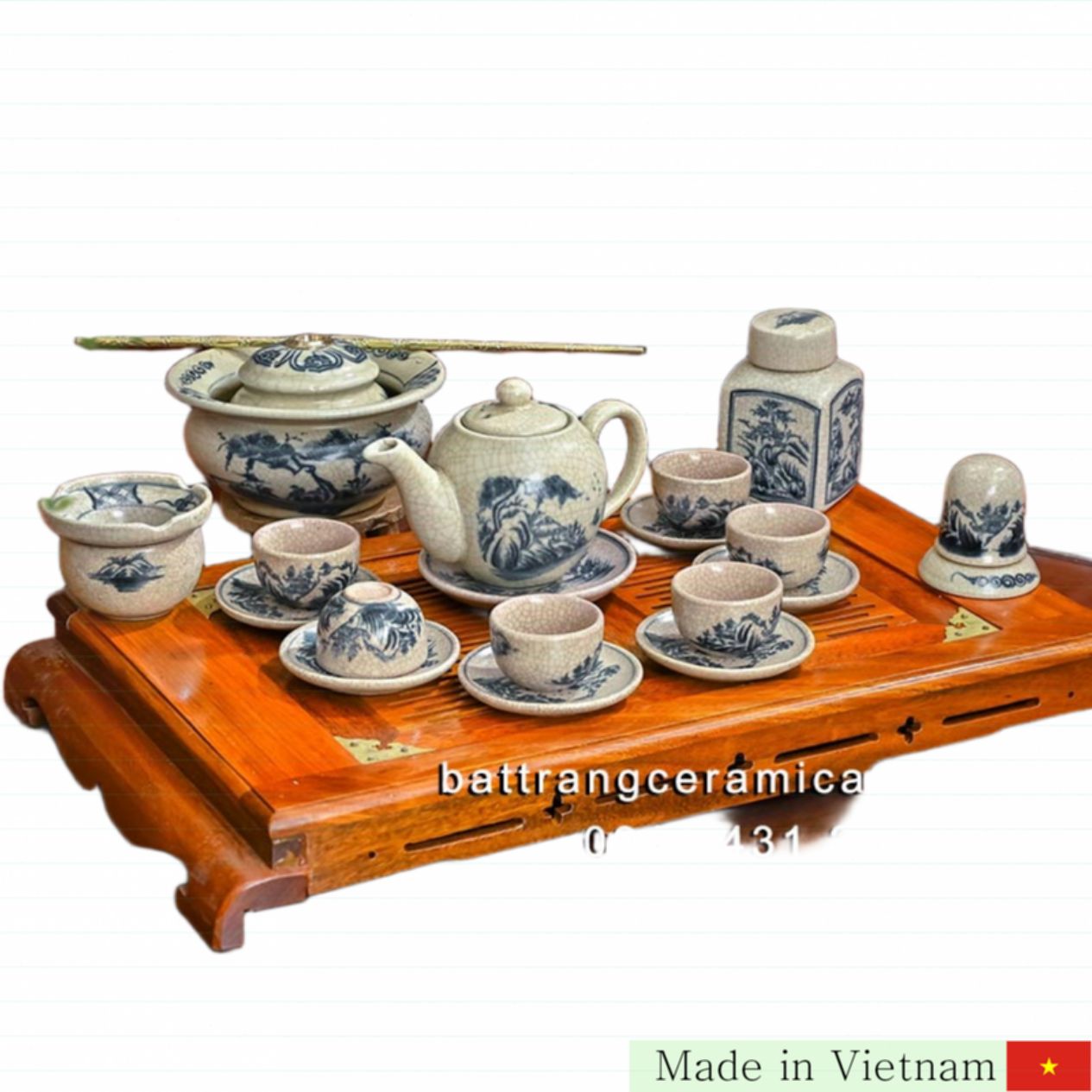 Bộ sản phẩm bao gồm 1 ấm trà, 6 chén, 7 đĩa kê, 1 ống tăm, 1 hộp chè, 1 gạt tàn và 1 điếu bát đầy đủ, tiện lợi cho mọi buổi trà đạo. Men rạn là loại men cổ đặc trưng của Bát Tràng, tạo nên hiệu ứng vết rạn tự nhiên trên bề mặt men màu ngà xám, với những đường rạn chạy ngang dọc chia thành nhiều hình dạng ấn tượng như tam giác, tứ giác, ngũ giác. Những đường rạn uyển chuyển không chỉ tăng tính thẩm mỹ mà còn làm nổi bật sự độc đáo và tinh tế trong từng chi tiết gốm.