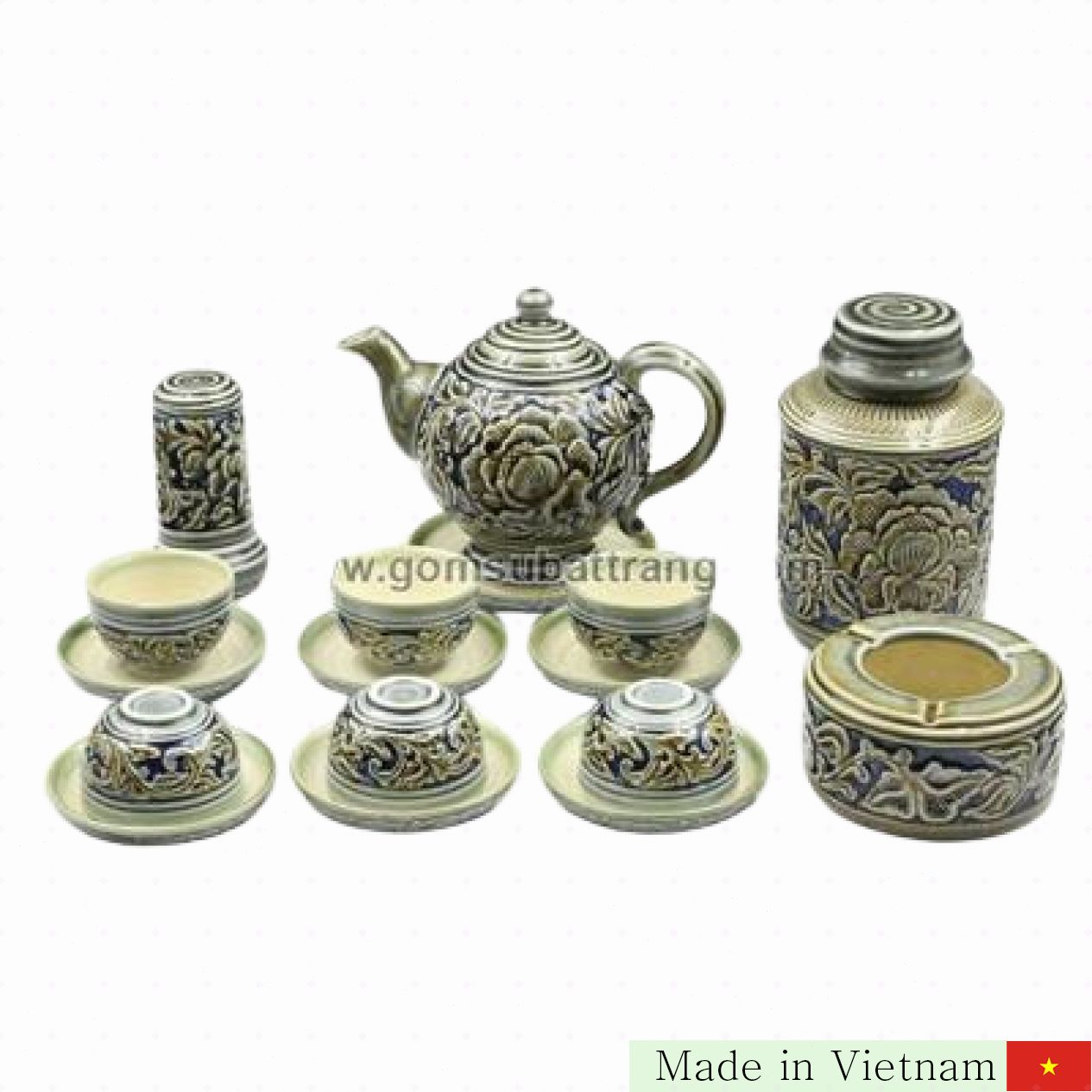 이 세트는 정교한 양각 기법으로 표현된 동백꽃 문양이 청자에 섬세하게 새겨져 있어 아름다움과 전통미를 동시에 느낄 수 있습니다.
