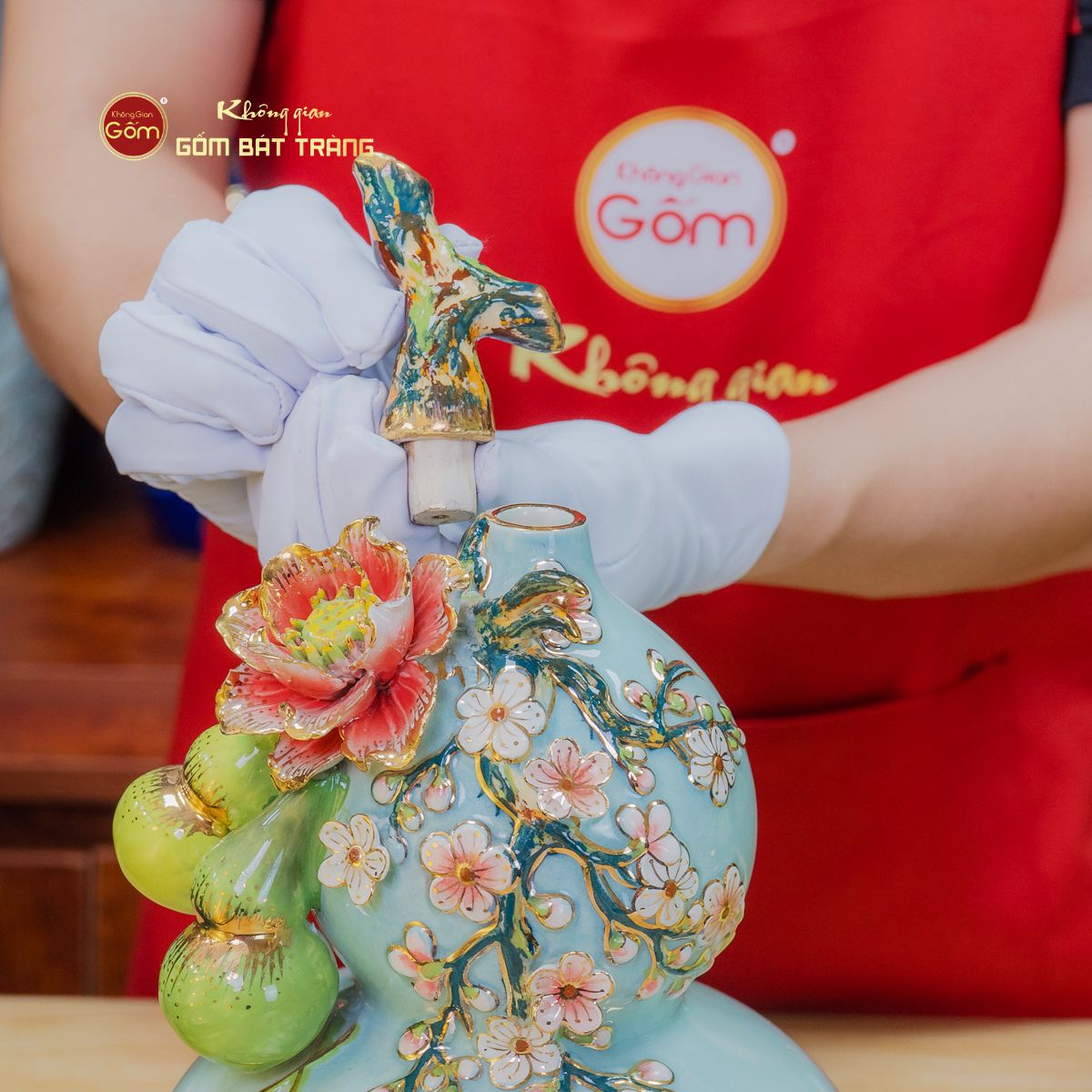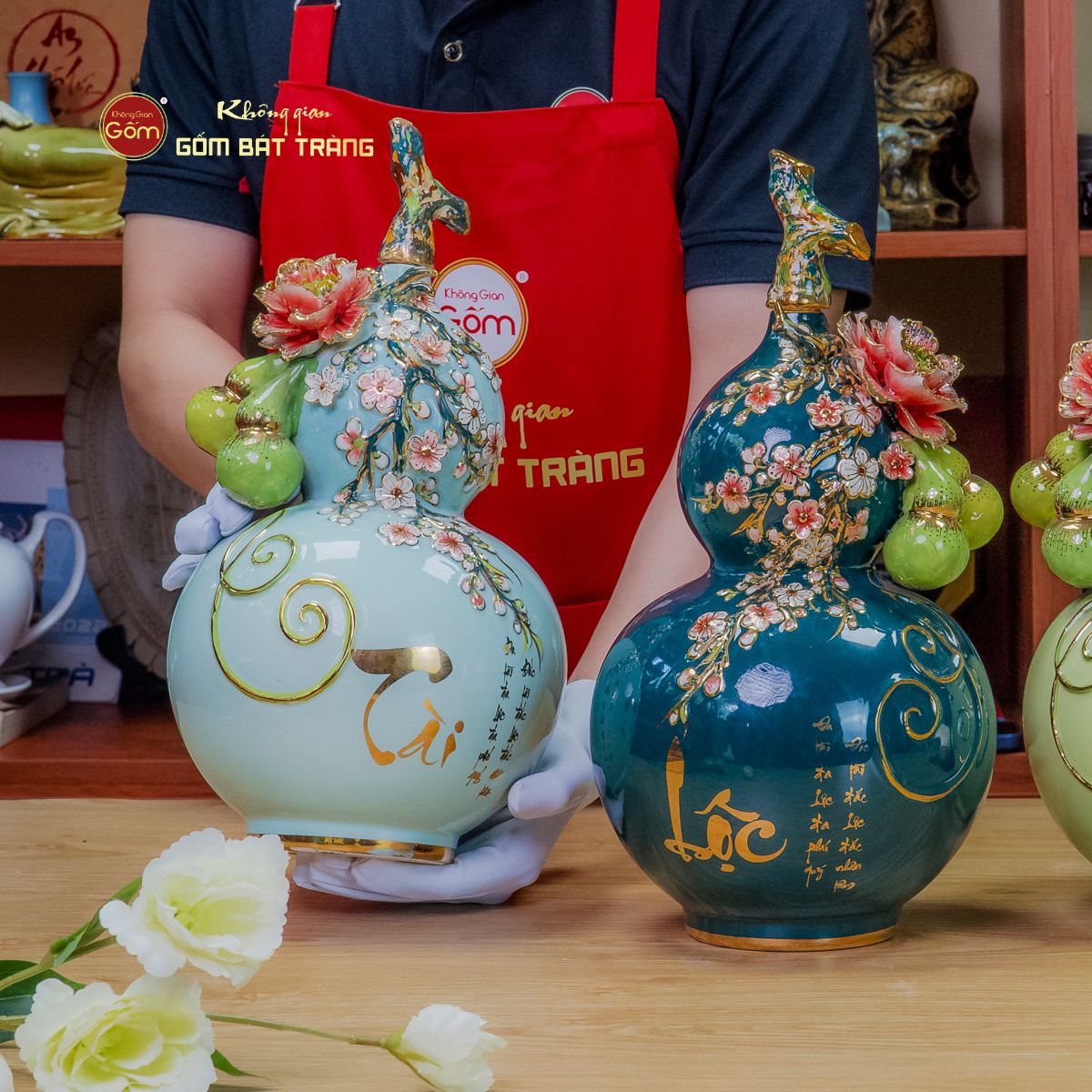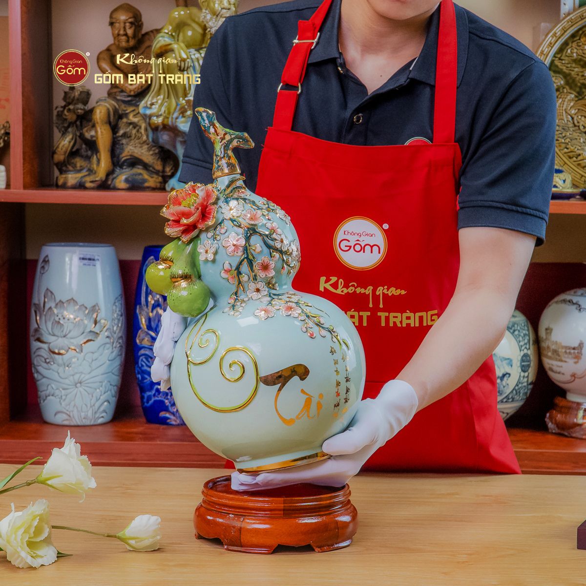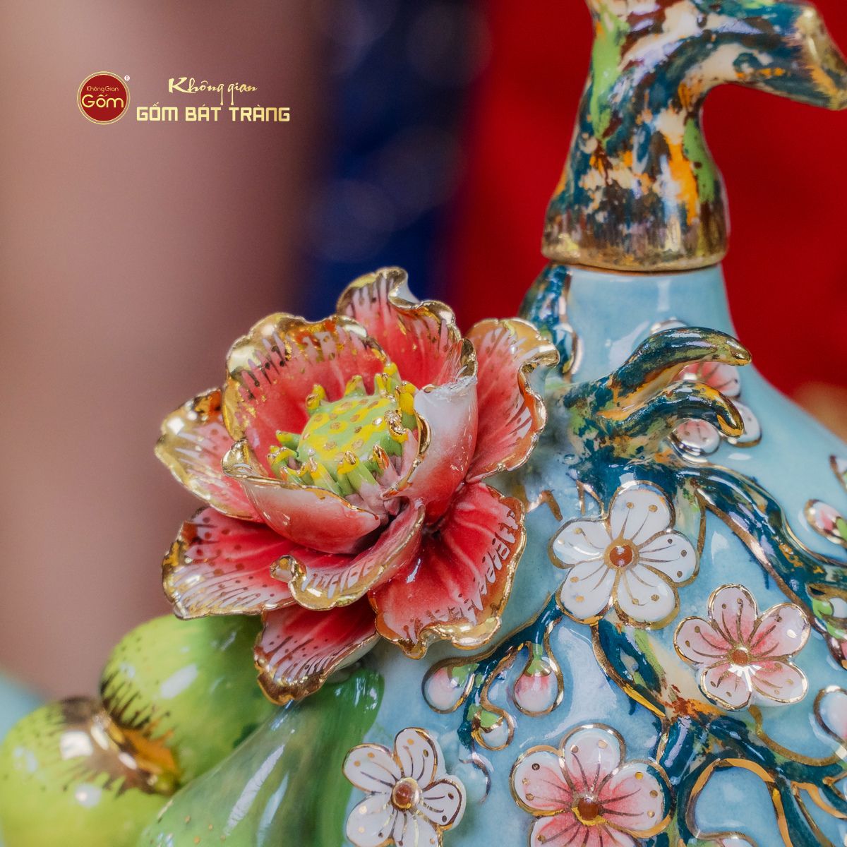 복숭아꽃과 모란꽃을 입체적으로 조각해 깊이감을 주었으며, 황금으로 수작업으로 그린 ‘재물(財)’ 글자와 섬세한 문양들이 더욱 고귀한 미감을 더합니다. 호리병 밑부분을 둘러싼 황금 테두리는 제품의 품격을 한층 올려주어 인테리어 소품으로도 빛을 발합니다.
