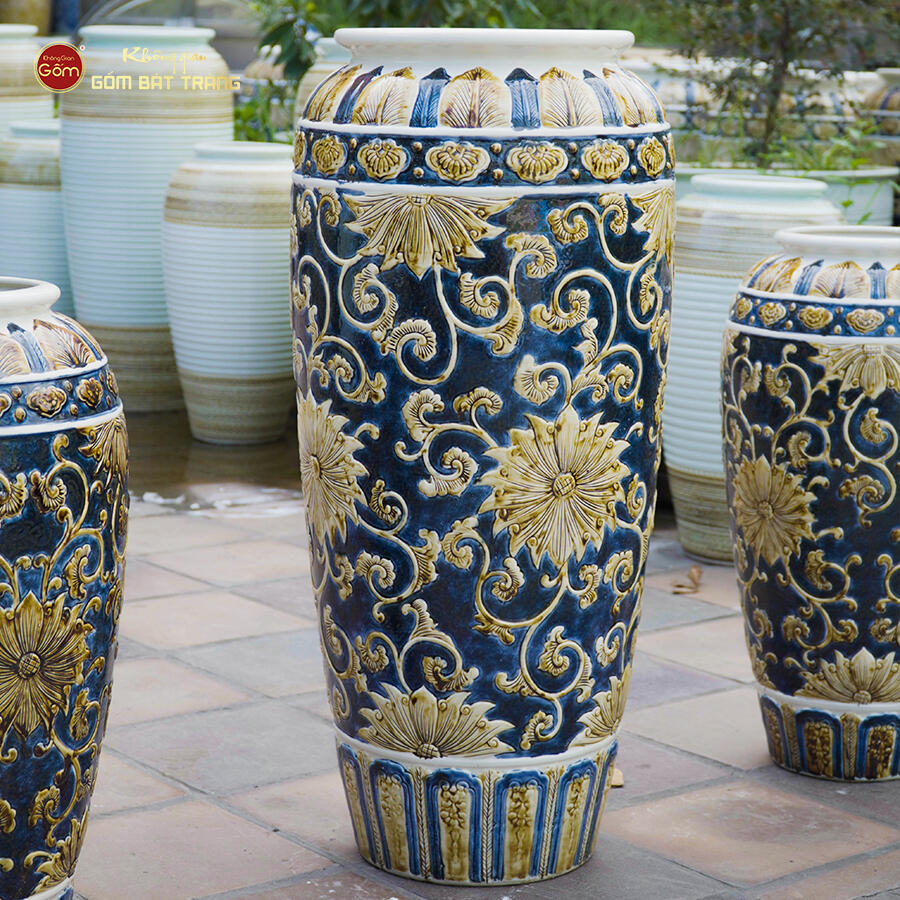디자인: 정교한 부조 꽃무늬가 푸른색과 노란빛 유약으로 아름답게 표현되어 고급스러운 분위기를 자아냅니다.