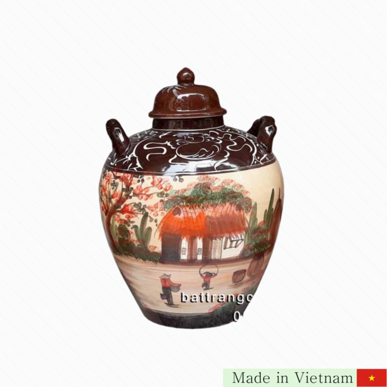 저희는 전통과 품격을 자랑하는 10리터 고향풍경 도자기 술병을 소개합니다. 이 술병은 베트남 바트짱(Bát Tràng) 도자기 장인이 손수 정성 들여 제작한 제품으로, 뛰어난 내구성과 안정성을 갖추고 있습니다. 두껍고 견고한 도자기 재질은 안전한 보관과 탁월한 음료 맛 보존에 최적입니다.