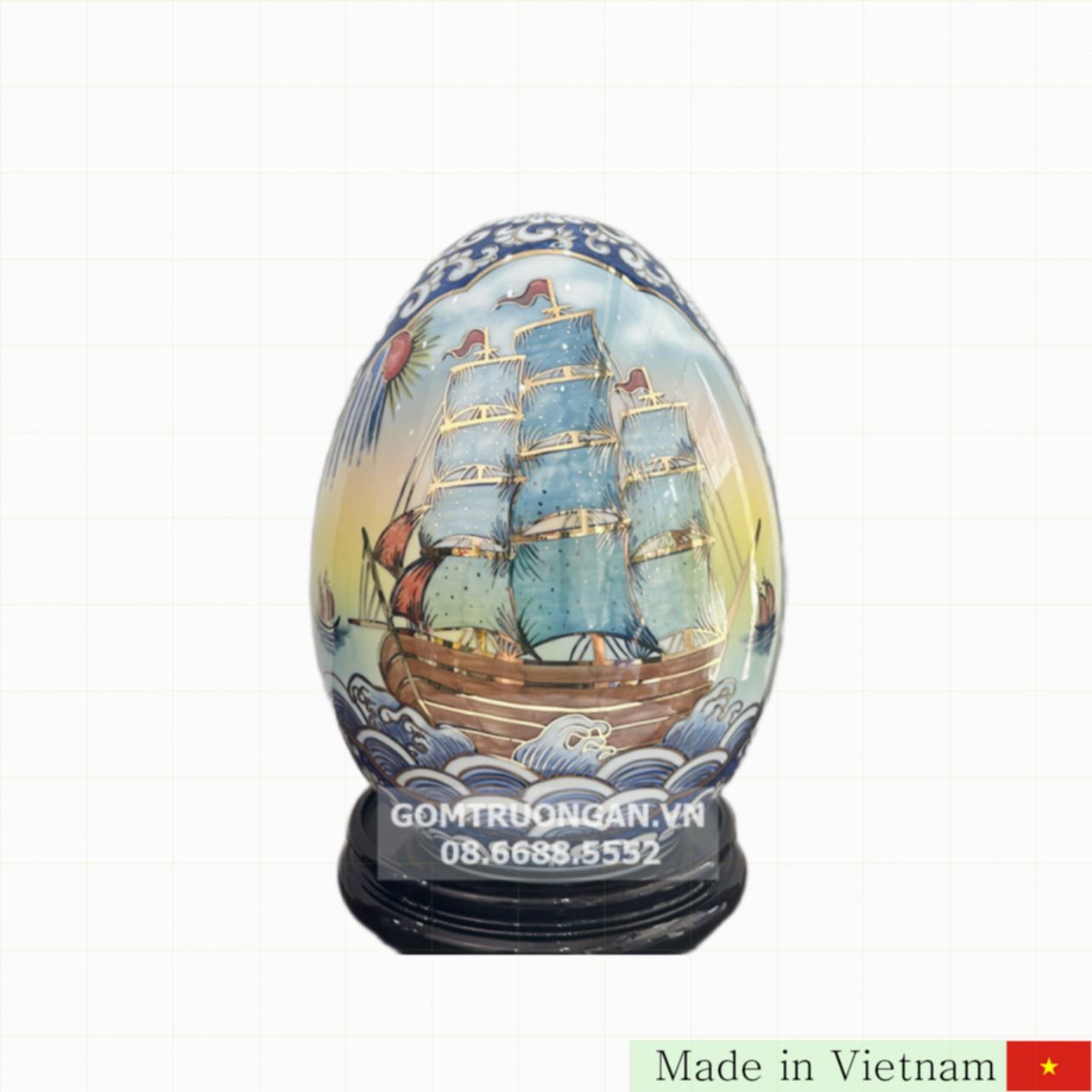 "순풍만리 번영과 부귀" 풍수 계란은 유명한 바트짱(Bát Tràng) 도자기 장인이 정성 들여 만든 명품입니다. 깊은 금빛 채색과 섬세한 손그림으로 장식되어 집안 어디에든 고급스러움을 더해줍니다. 이 제품은 풍수 인테리어의 중심으로써 거실이나 책상 위에 두면 행운과 번영을 불러온다는 의미를 지니고 있습니다. 꽃이나 공작 깃털을 꽂아 장식할 수 있어 다양한 활용이 가능합니다.