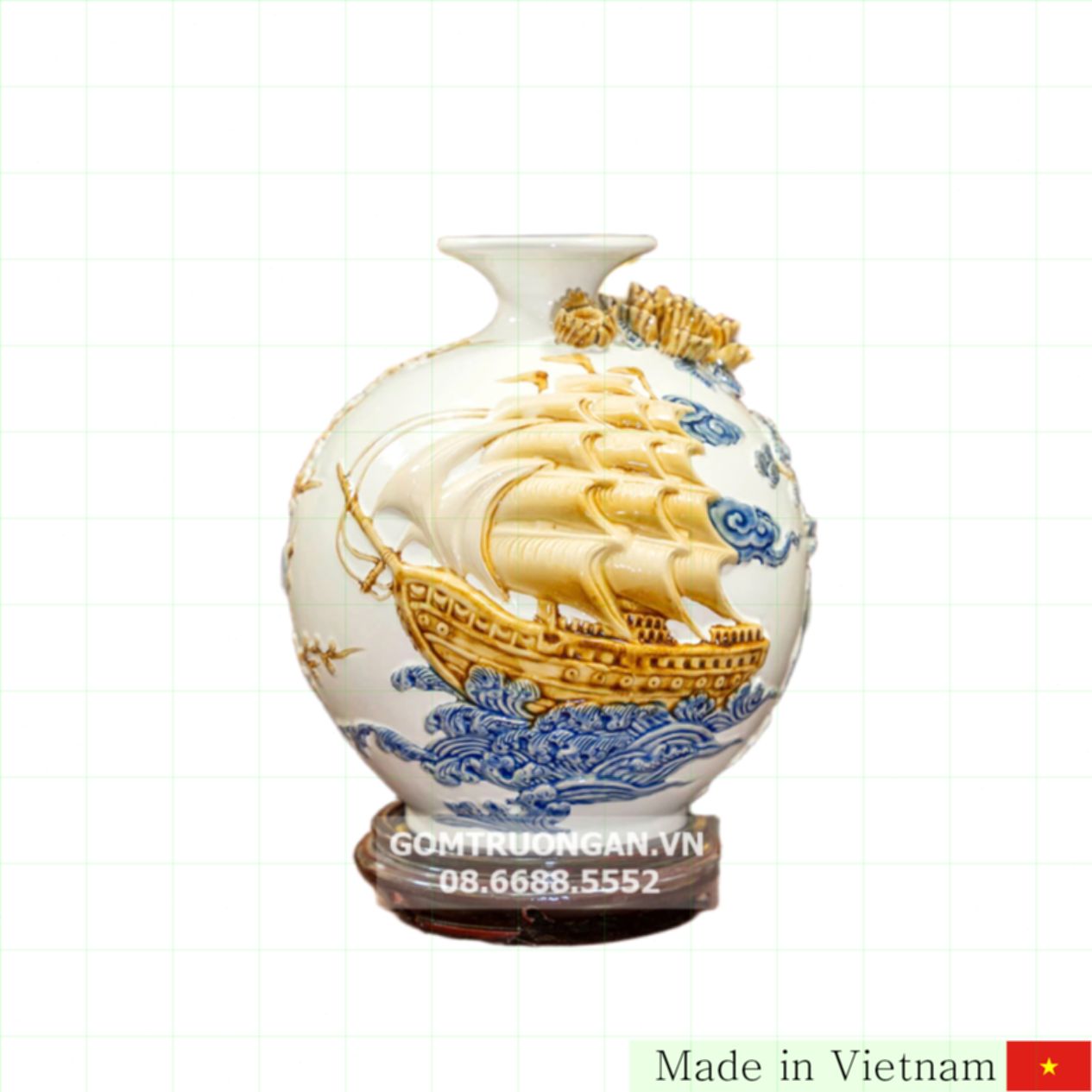 저희가 소개하는 30cm 크기의 부조 도자기 복주머니 항아리는 전통적인 Bát Tràng 도자기의 정수를 담았습니다. 행운과 재물을 끌어들이는 'Thuận Buồm Xuôi Gió' 문양이 섬세하게 새겨져 있어 공간에 활력을 불어넣고 운세를 상승시켜줍니다. 이 항아리는 집안, 사무실 어느 곳에 두어도 운기 상승과 분위기 개선에 탁월합니다.