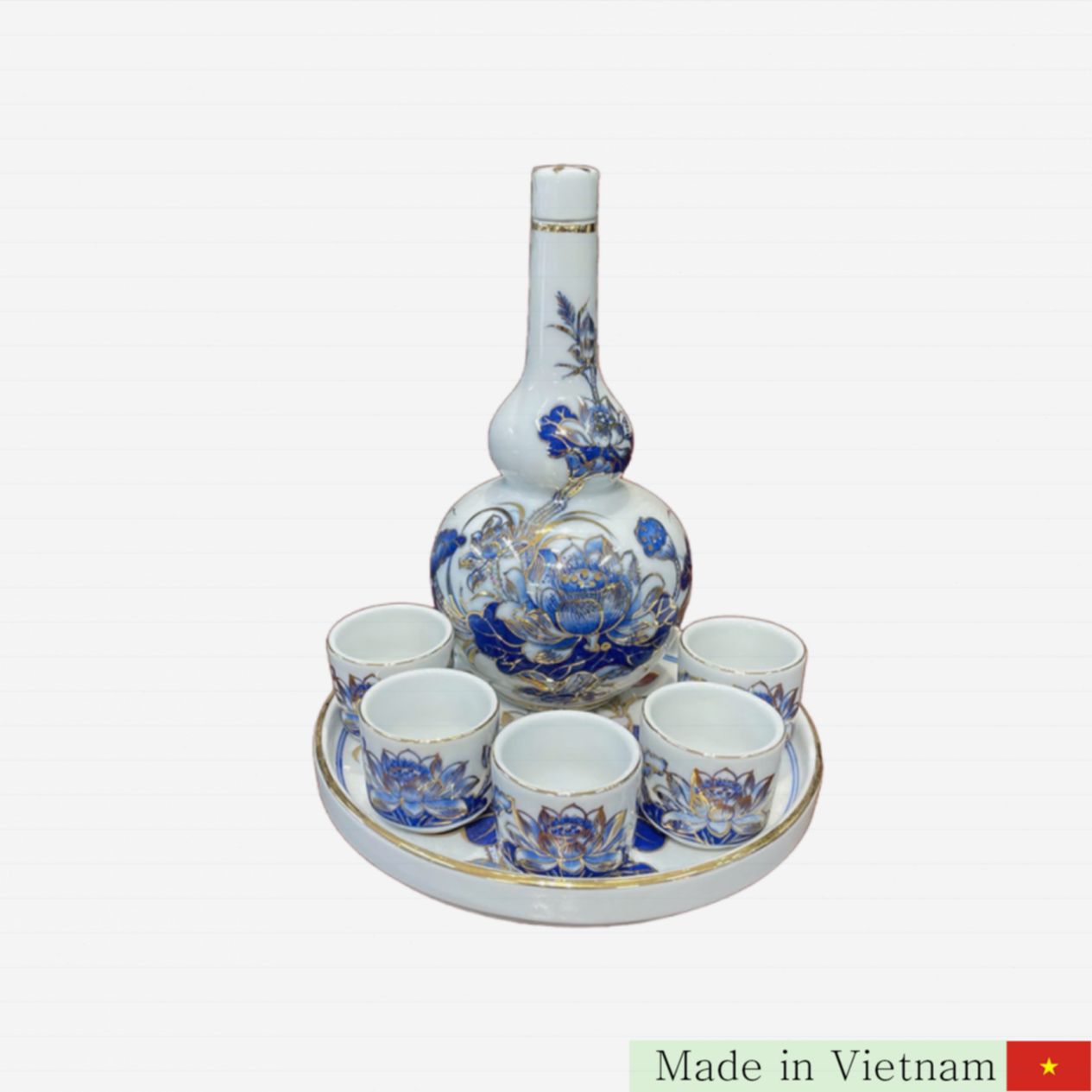 저희는 전통과 품격이 깃든 박장(Bát Tràng) 도자기 술병 세트를 소개합니다. 이 제품은 세련된 파란색과 황금 연꽃 문양이 조화를 이룬 수작업 도자기로, 신성한 제단에 훌륭한 장식이자 의례용품입니다. 술병 한 개, 접시 하나, 그리고 5개의 술잔으로 구성되어 있어, 제단 크기 1m55 이상에 완벽히 어울립니다.