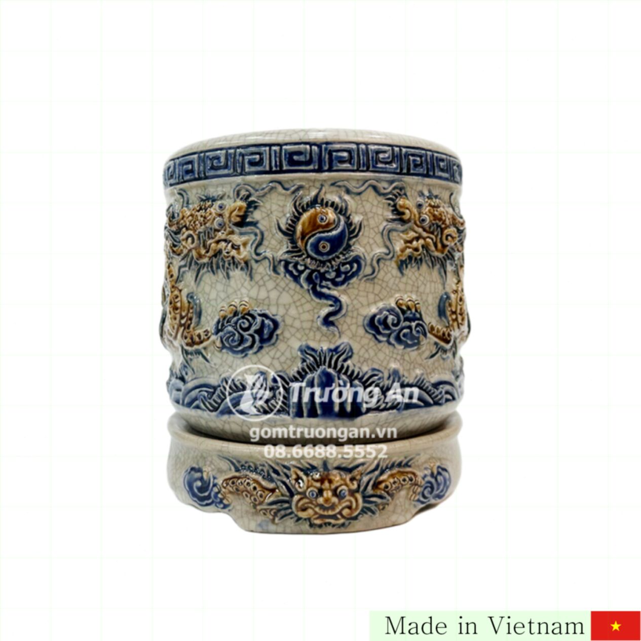 저희가 자랑하는 이 선명하고 우아한 20cm 크기의 박복룡 무늬 청자 향로는 고급스러운 바탕과 뛰어난 장인정신이 돋보입니다. 바트쨍(Bát Tràng)에서 전통기법으로 제작된 이 향로는 선명한 크랙유와 정교한 용 문양이 손수 조각되어, 완벽한 예술품의 품격을 자랑합니다.