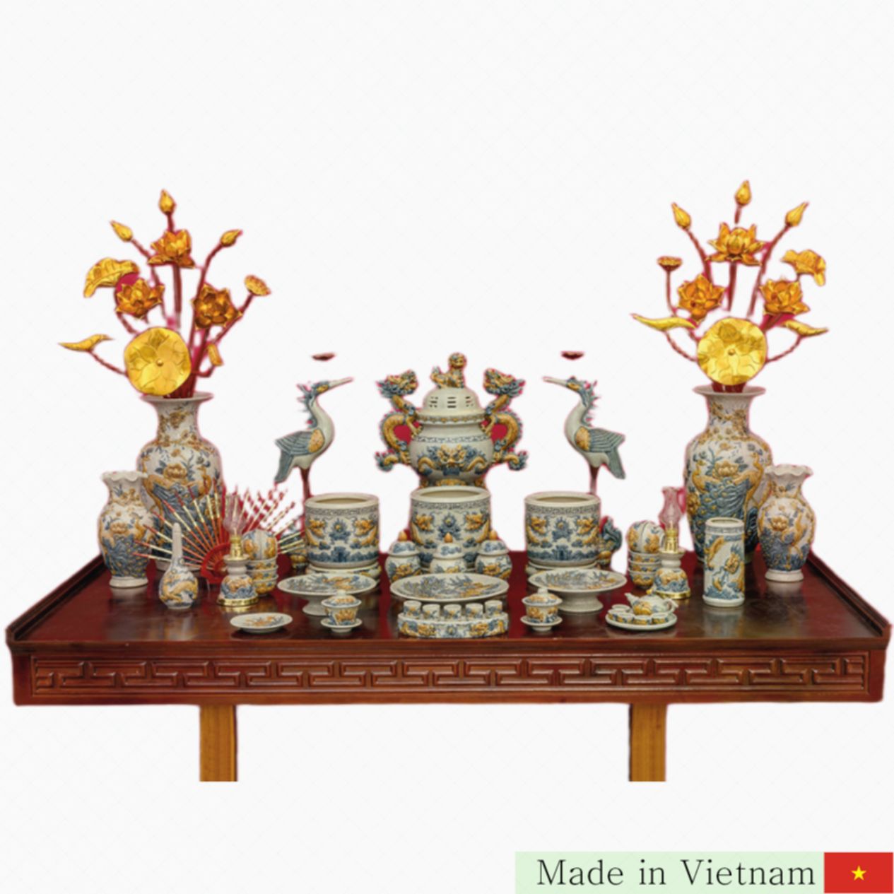 이 제품은 전통과 장인정신이 어우러진 바트랑(Bát Tràng) 명품 제사세트로, 2.17m 규모의 제단에 완벽하게 어울리는 고급 도자기 제품입니다. 정교한 용 문양이 돋보이는 수작업 기법과 고급 도자기 소재로 만들어져, 제례 공간에 품격과 장엄함을 더합니다.